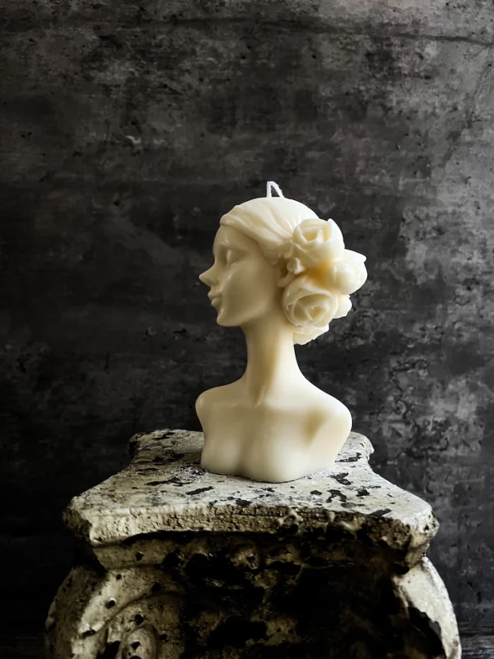 This vegan candle boasts delicate facial features, a stunning flower crown, and intricate detailing. Infused with a feminine scent, it’s the perfect addition to your home decor.
